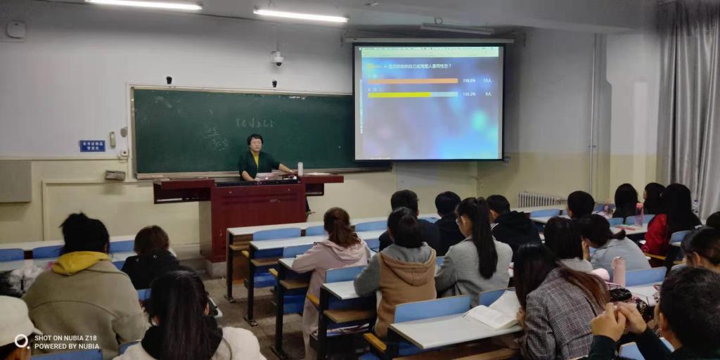 理学院党委副书记邹爱婕老师,邹老师就两性问题开展本次讲座,以问卷调查的形式渐进主题,她用浅显的语言,生动的实例,结合大数据分析为同学们深刻讲解两性关系。