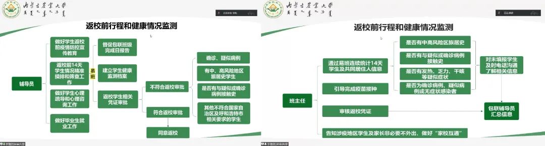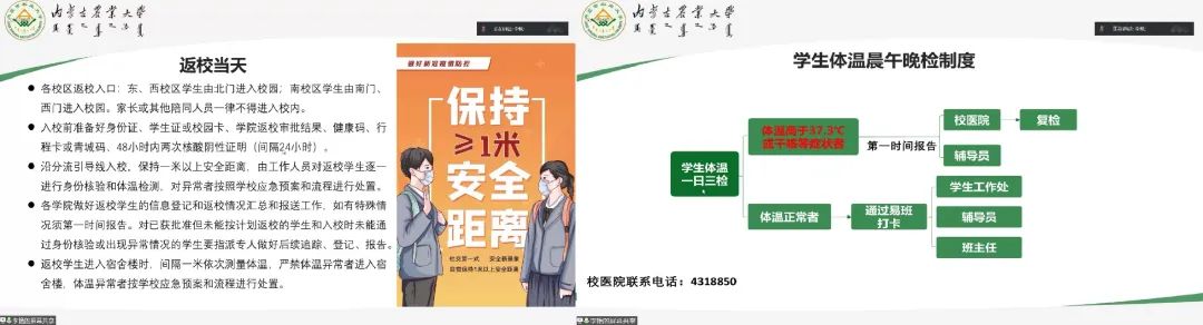此次会议根据学生返校前后可能遇到的各种疫情特殊情况和对应的预案展开。主要有:“三区两通道”和穿脱防护服等基本知识和技能、师生健康管理制度、应急处置流程及措施和家长信息通报制度四部分内容。会议中,李艳老师对“三区两通道”设置的具体含义和作用做了详细说明。师生健康管理制度方面,从学生返校管理,学生学习、生活中的详细管理措施到学生的心理危机干预工作均做了全面且细致的讲解。学院工作部门与学生和家长做到家校互通,通过多种方式实行信息通报,掌握学生返校前后的实际情况。
