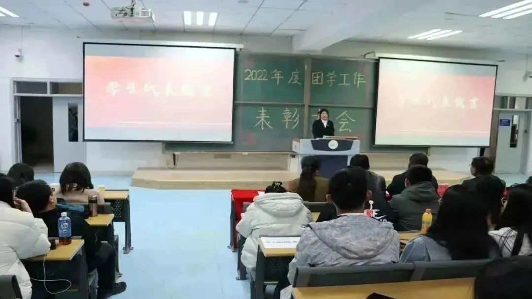 在南教114教室召开2022年度团学工作表彰大会。学院党委书记靳国斌、党委副书记李艳、副院长刘杰才、副院长杨忠仁、关工委副主任孙伯筠出席此次会议。教研室主任、班主任、辅导员、获奖教师、获奖学生以及学生代表共计200余人参加会议。