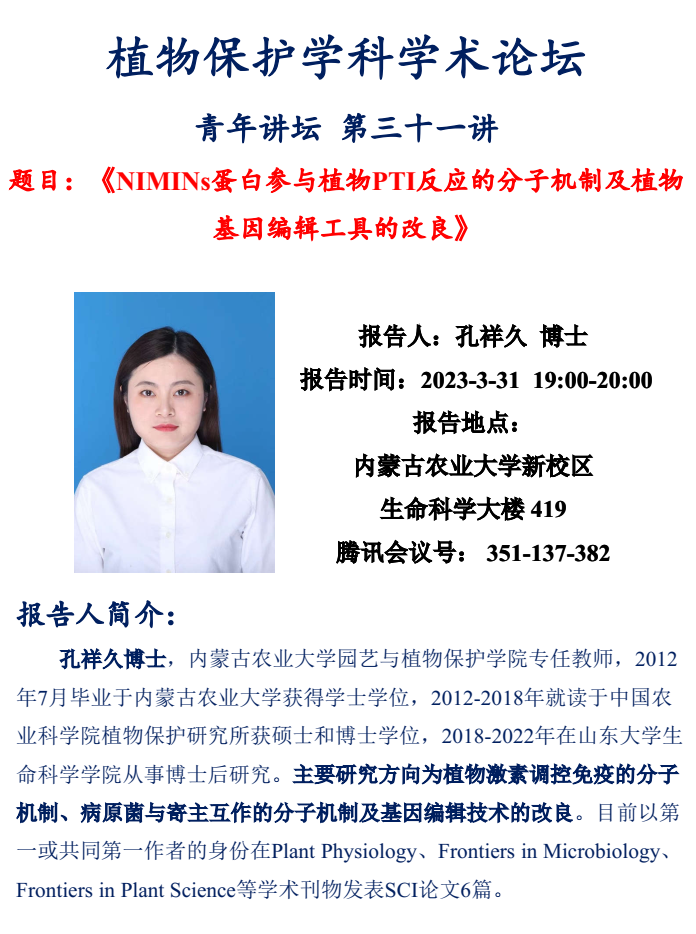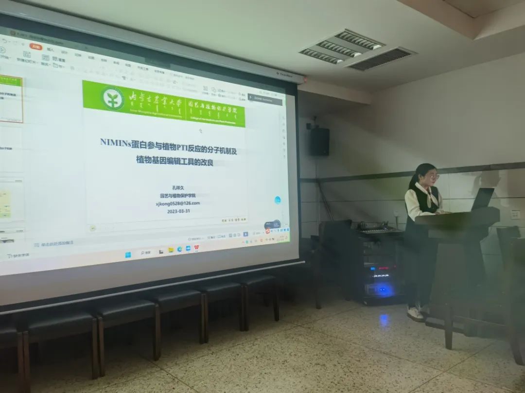 高层次人才引进青年教师孔祥久,孔博士首先介绍了NIMINs家族蛋白参与植物的模式识别受体诱导的免疫反应(PTI)的分子机制。在PTI过程中,NPR1的互作蛋白NIMINs受水杨酸(SA)上调表达且正调控植物的抗病表型;NIMINs通过干扰NPR1与WRKY54/70转录阻遏物的结合,以允许激活类的WRKY转录因子正调控PTI基因表达,最终导致植物PTI反应的正常进行。该研究不仅阐明了NIMINs家族蛋白在PTI中的作用,也揭示了一种独特的SA调控PTI的信号通路。此外,孔博士也介绍了提高拟南芥基因编辑突变体筛选效率的新方法及快速获得非转基因基因编辑突变体的筛选方法,两种方法可以有效减少基因编辑突变体筛选消耗的人力物力。