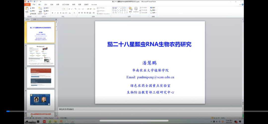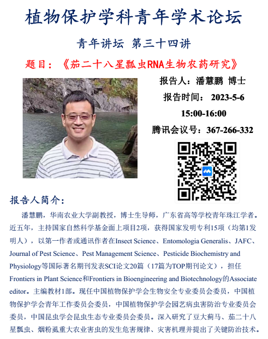 植物保护学科青年论坛的第三十四期荣幸邀请到了华南农业大学,植物保护学院昆虫系的优秀博士生导师潘慧鹏,为植保学科师生们带来“茄二十八星瓢虫RNA生物农药研究”的精彩学术报告。潘老师通过对RNAi技术的发展历程到具体应用,从靶标基因的筛选策略与dsRNA高效合成,到RNA生物农药的安全性评估做了充分的讲解,并结合自身的科研经历与学科青年教师及广大研究生们深入探讨了RNA生物农药未来的发展方向、应用前景。