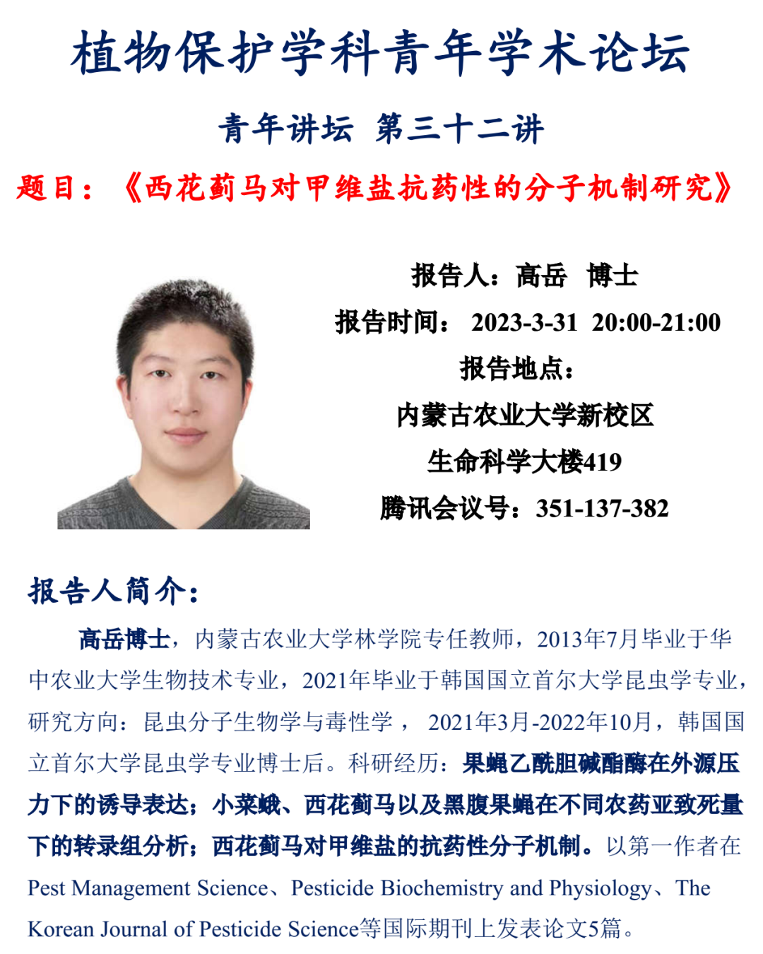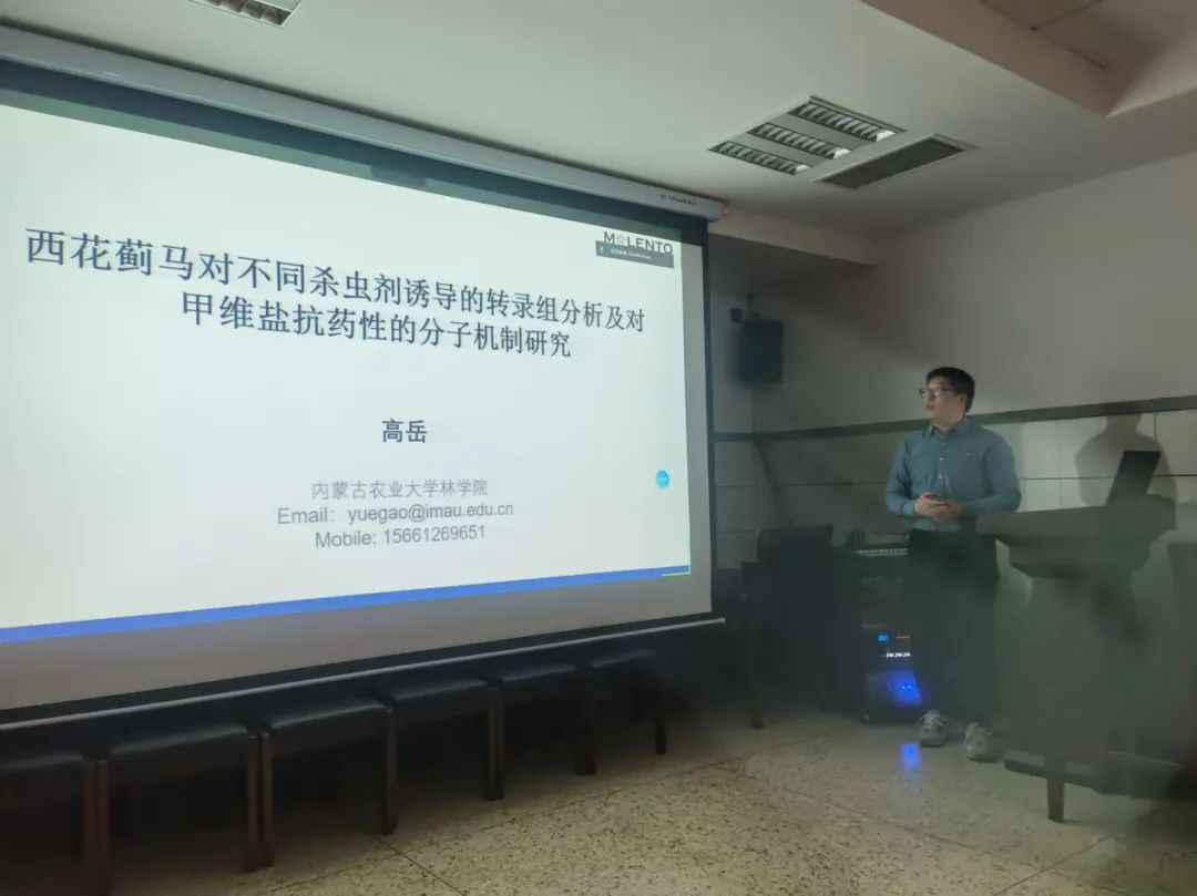 高层次人才引进青年教师,来自林学院的高岳老师。高博士在韩国首尔大学昆虫系获得了博士学位,并从事博士后研究工作。高博士就世界重大害虫西花蓟马、小菜蛾等受到不同杀虫剂亚致死浓度处理后的转录组进行分析,并就西花蓟马对甲维盐产生抗药性的分子机制,从表皮穿透、解毒代谢、靶点突变等几个方面进行的验证实验做了系统地研究汇报。会后,高岳博士与成人网教师及广大研究生进行了充分地探讨交流。