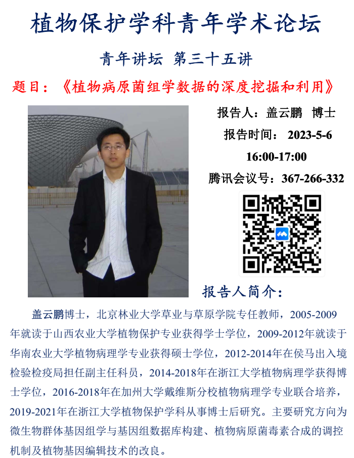 第三十五期,我们邀请到了北京林业大学草原与草业学院的盖云鹏老师。盖博士就攻读博士及博士后期间开展的链格孢菌的侵染循环和寄生专化毒素、MetR调控链格孢菌抗氧化机制研究、MetR突变体谷胱甘肽代谢通路变化、MetR抗ROS氧化的分子机制、比较基因组学研究、生物信息学分析及代码编写等研究内容及研究经历做了交流汇报,同时分享了自身关于科研兴趣爱好的挖掘和培养,与师生们做了深入的交流探讨,特别是盖老师提出:许多科学问题是来源于实践当中,我们应该积极挖掘自身的兴趣爱好,敢于求先、不断探索,保留自己的好奇心,并不断驱动自我寻找科学答案。
