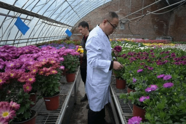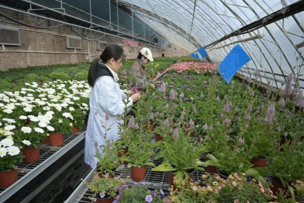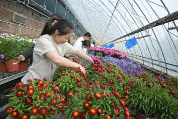 在研究生指导下,来自重庆市职业院校的教师们来到草花种植大棚,进行新鲜花材的采摘工作。