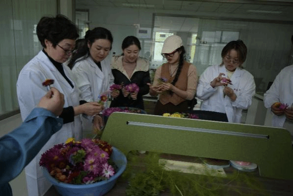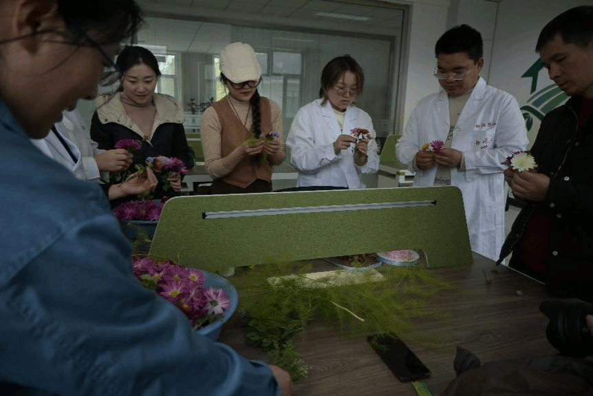 采摘完成后,在科技小院驻扎的研究生详细讲述了胸花制作的技术要点并进行操作示范,老师们便进入了紧张而富有创意的胸花手工艺制作环节。