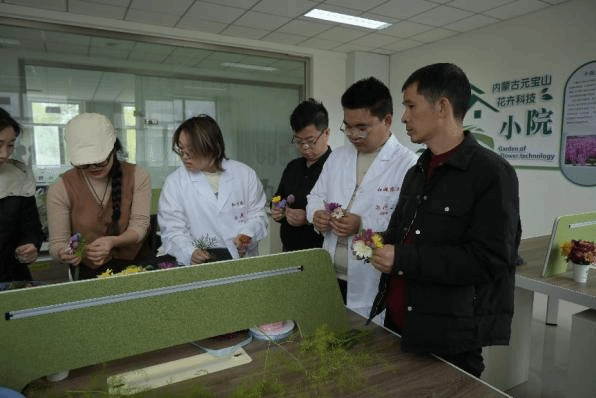 2024年10月30日,成人网23级观赏园艺专业研究生李学芬和庆少龙带领重庆市职业院校教师素质提高计划培训班的教师在内蒙古元宝山花卉科技小院学习花艺作品制作。
